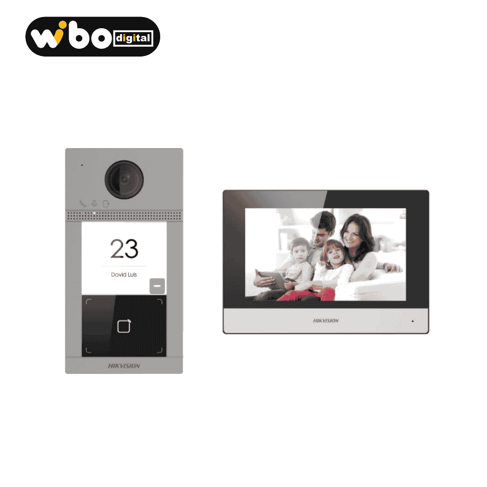 O Hikvision DS-KIS614-P é um kit completo de videoporteiro IP que combina segurança, praticidade e tecnologia avançada. Inclui uma unidade externa com câmara de alta definição e uma unidade interna com ecrã tátil de 7”, permitindo comunicação clara e controlo de acesso eficiente.